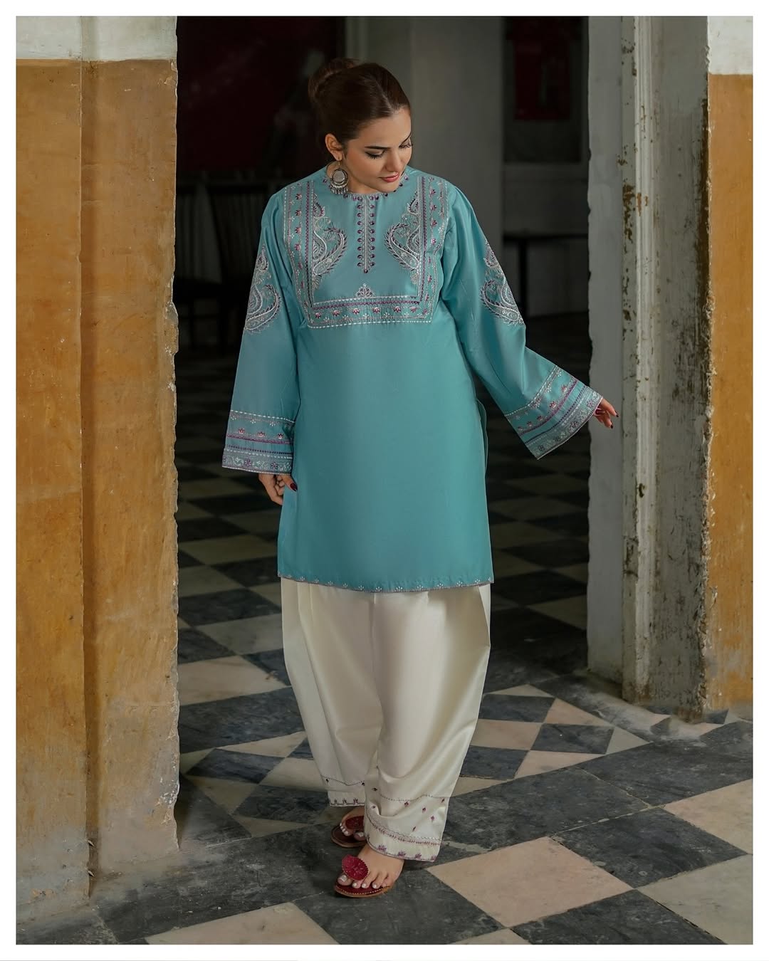 An elegant blend of embroidery and print, featuring premium lawn front, back, and sleeves with...
