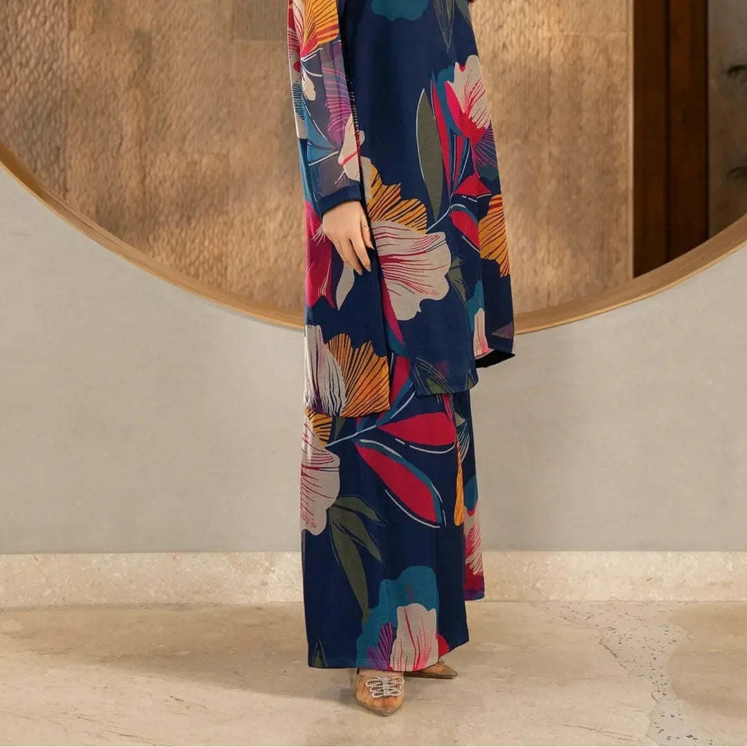 Given the light drape and slight translucency of the sleeves, the garment is likely made from a lightweight, smooth fabric suitable for winter layering, such as khaddar, a fine georgette, or a high-quality crepe/silk blend. The texture suggests a comfortable, non-bulky material that holds the print well