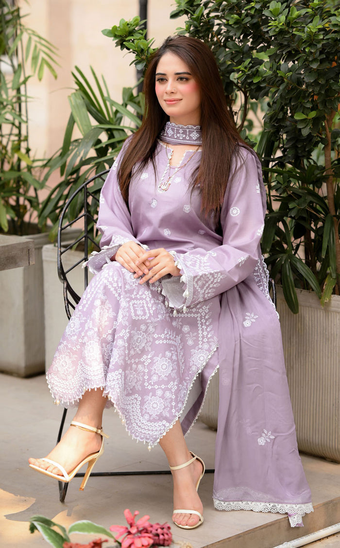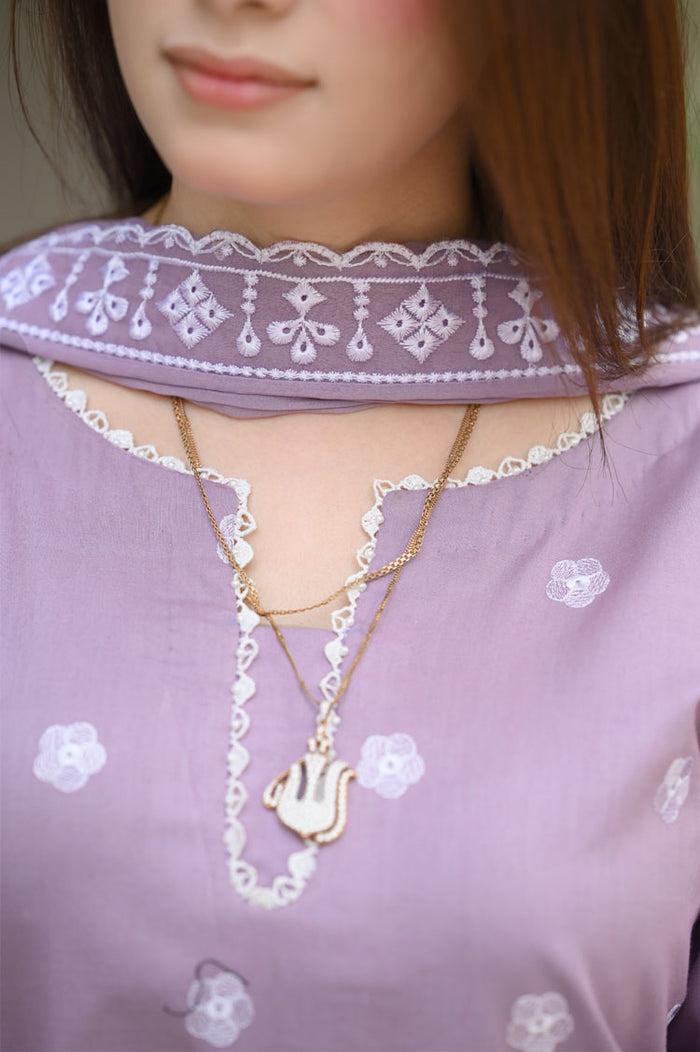 An elegant pastel lavender embroidered ensemble, crafted from premium fabric and adorned with delicate white threadwork. The design features intricate embroidery on the front, hemline, and sleeves, finished with lace detailing for a refined touch. A perfect blend of grace and comfort, ideal for both casual and semi-formal occasions
