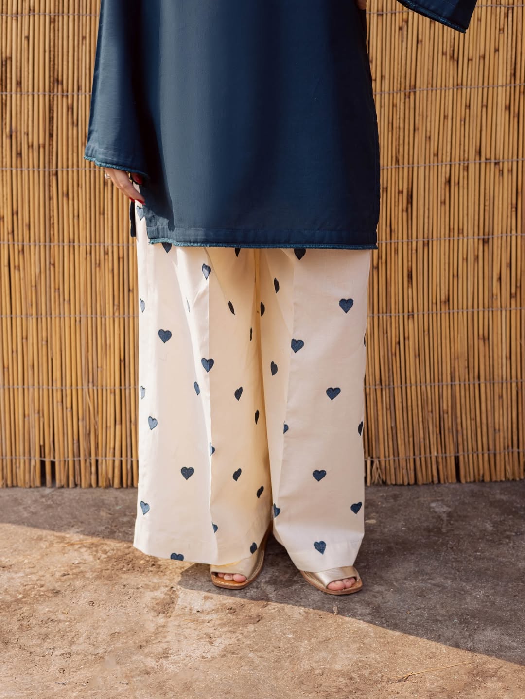 A stylish two-piece outfit featuring a maroon kurta paired with ivory wide-leg trousers adorned with delicate heart prints. Comfortable, elegant, and perfect for casual wear or festive day gatherings.